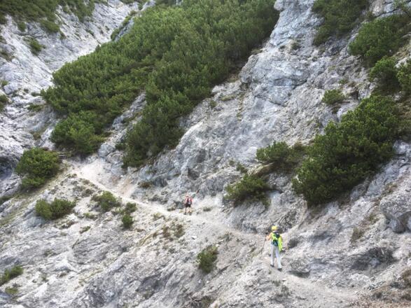 Ausgangspunkt für diese anspruchsvolle Wanderung ist der Parkplatz zur Steinalm, der über die B311 und den Ortsteil Bürgerau zu erreichen ist. Zuerst auf Forstweg und breitem Wanderweg steigt man bis zur Haidensperre auf, der etwas oberhalb nach links in den Steinkarlweg mündet. Ein schmaler, anspruchsvoller Steig mit gewaltiger Aussicht, der bei der Steinalm endet. Hier beginnt der Steig entlang der Bergflanken des Persailhorns. In beeindruckender Felskulisse und durch Latschenfelder schlängelt sich der Steig hoch, bis der Kinalkopf und somit die Peter Wiechenthaler Hütte erreicht ist.